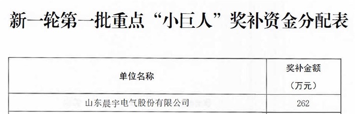 2022年公司入選國家第四批專精特新“小巨人”企業,2024年晨宇電氣憑借技術研發實力、自主創新能力榮耀上榜,成功躋身國 家級專精特新重點“小巨人”企業行列。此次入選國 家級專精特新重點“小巨人”企業,更加證明了晨宇電氣**的科技實力。